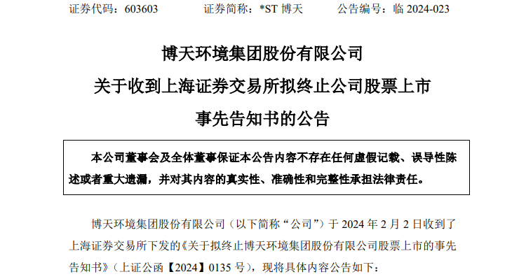 *ST博天(603603)2月2日晚间公告,因公司收到《行政处罚决定书》将被实施重大违法强制退市,公司股票自2024年2月5日(星期一)开市起停牌。