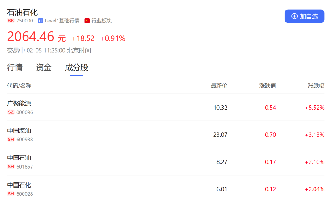今日早间,石油是少有几个抗跌的板块之一,板块指数盘中一度放量涨逾2%。广聚能源盘中一度垂直拉升,最高触及涨停,仅1小时成交就超过前一交易日全天成交;三桶油全线逆势飘红。