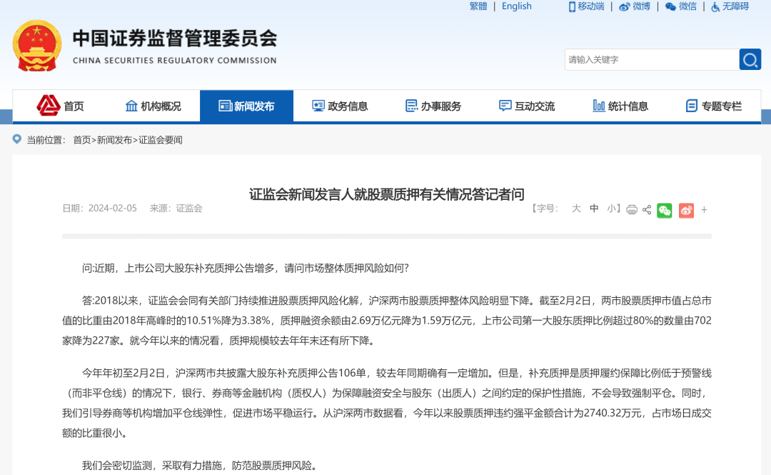 来源:证监会网站 据证监会2月5日消息,证监会新闻发言人就股票质押有关情况答记者问。