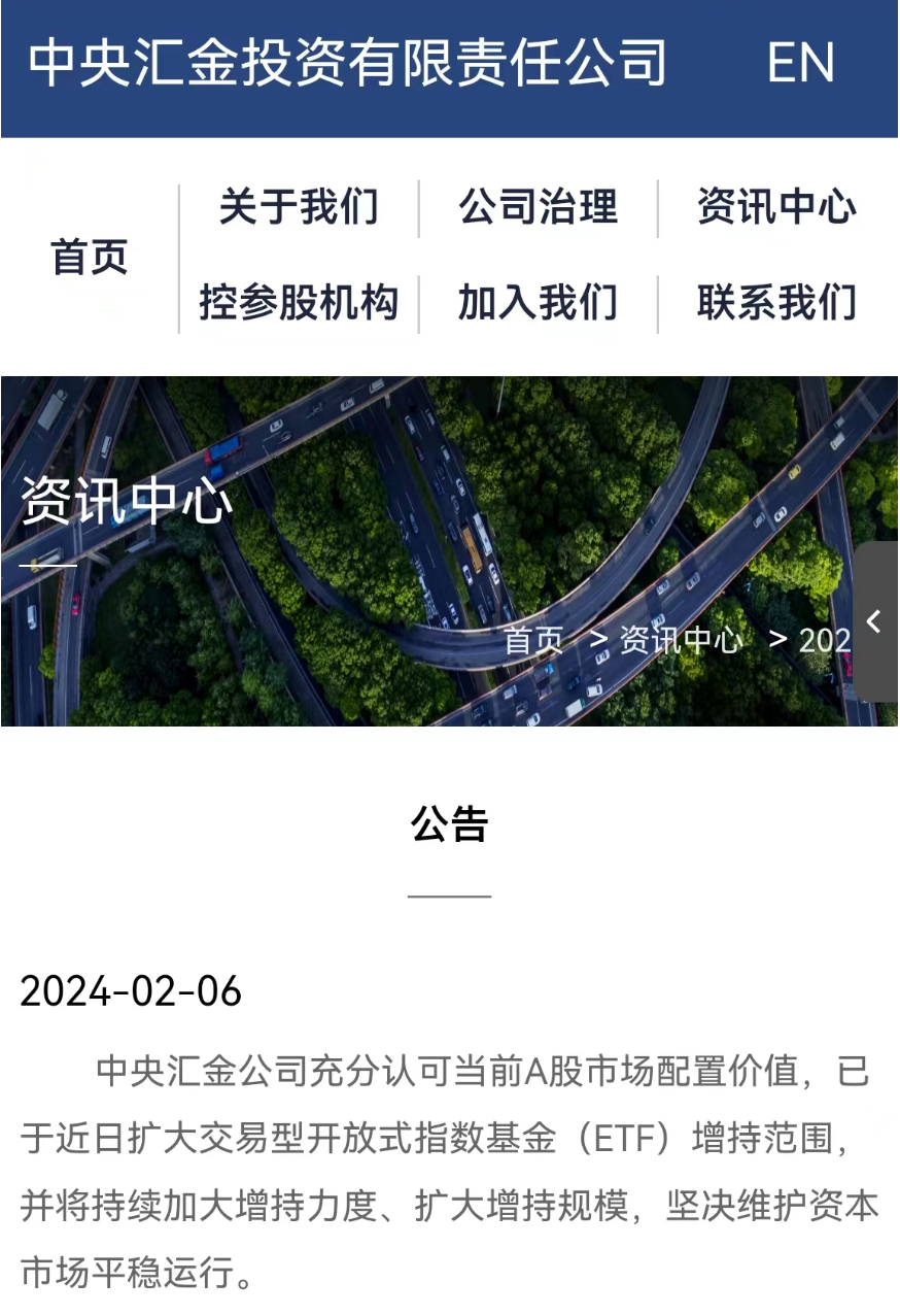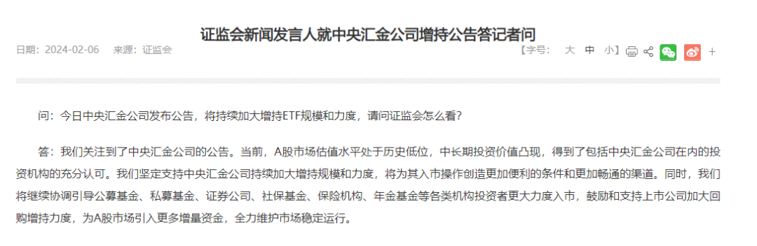 2月6日早盘,中央汇金、证监会集体发声。中央汇金公司发公告称,充分认可当前A股市场配置价值,已于近日扩大交易型开放式指数基金(ETF)增持范围,并将持续加大增持力度、扩大增持规模,坚决维护资本市场平稳运行。