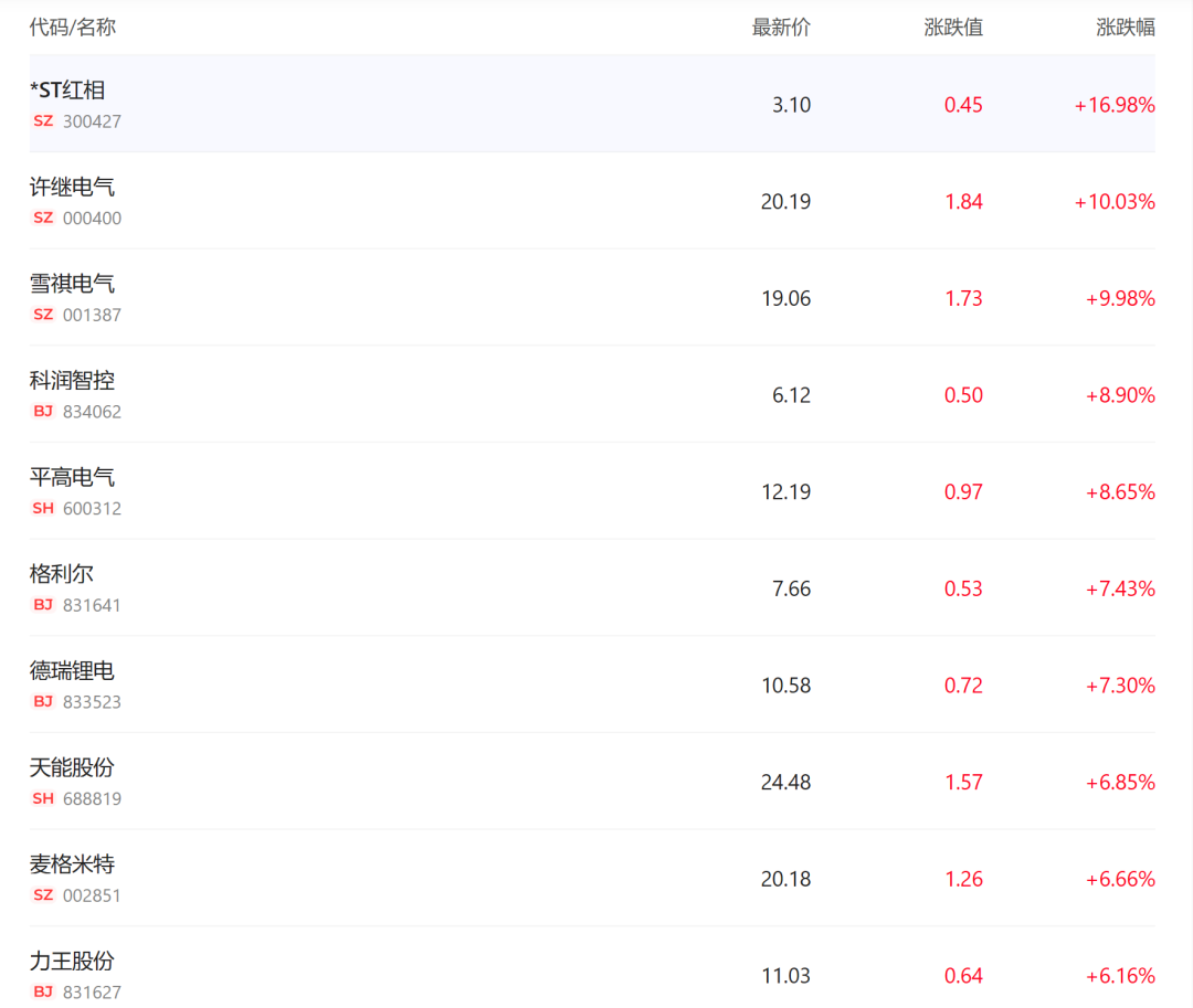 电气设备股早间也触底反弹,板块指数一度涨逾2%,许继电气、协鑫集成等涨停或涨超10%。细分光伏、风电、智能电网等板块也表现活跃,大族激光、电投产融等强势涨停。