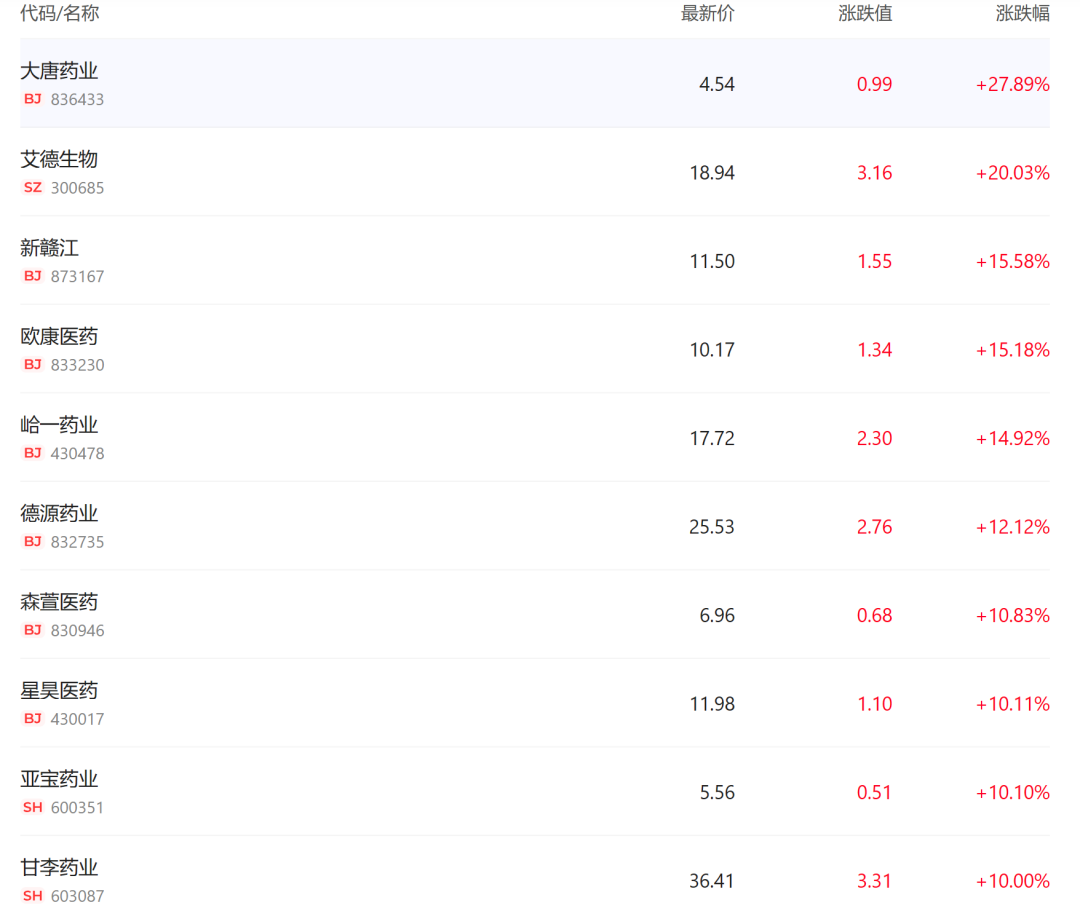 医药、医疗保健板块早间全线大幅上攻,板块指数均涨超3%。医药股方面,大唐药业触及30%涨停,欧康医药、亚宝药业等逾10股涨停或涨超10%;医疗保健方面,鹿得医疗、英科医疗、九安医疗等涨停或涨超10%。