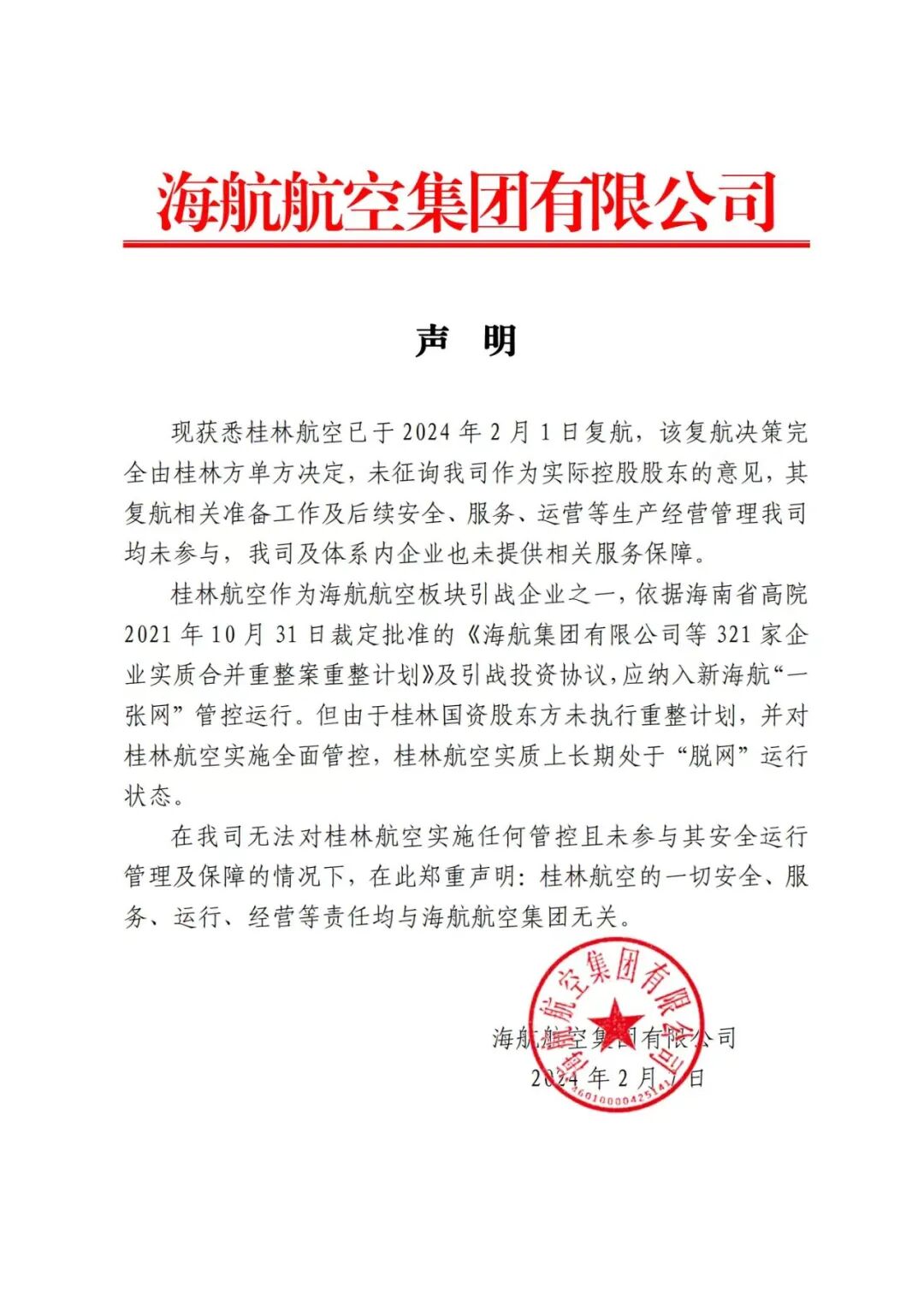 然而,仅一周时间,2月7日凌晨,海航航空集团即发布声明。按其说法,桂林航空的复航属于“单飞”行为。