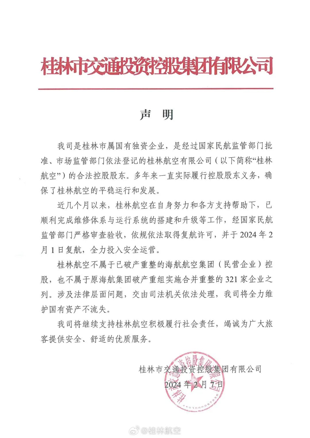 针对海航集团的声明,桂林交投2月7日也作出回应。桂林交投认为,桂林航空不属于已破产重整的海航航空集团(民营企业)控股,也不属于原海航集团破产重组实施合并重整的321家企业之列。涉及法律层面问题,交由司法机关依法处理,公司将全力维护国有资产不流失。此外,公司将继续支持桂林航空积极履行社会责任,竭诚为广大旅客提供安全、舒适的优质服务。