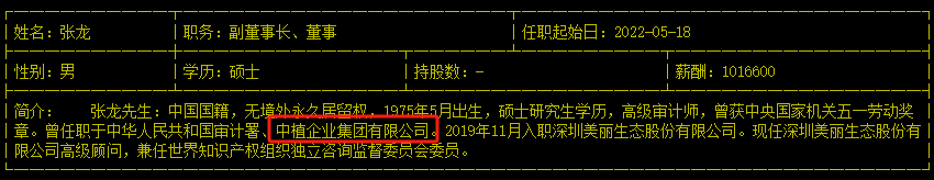 据公开信息显示,张龙在2021年4月份提名当选为美丽生态董事,当时公告称张龙为中国国籍,无境外永久居留权,1975年5月出生,硕士研究生学历,高级审计师,曾获中央国家机关五一劳动奖章。曾任职于中植企业集团有限公司。2019年11月入职美丽生态,此前任美丽生态高级顾问,兼任世界知识产权组织独立咨询监督委员会委员。