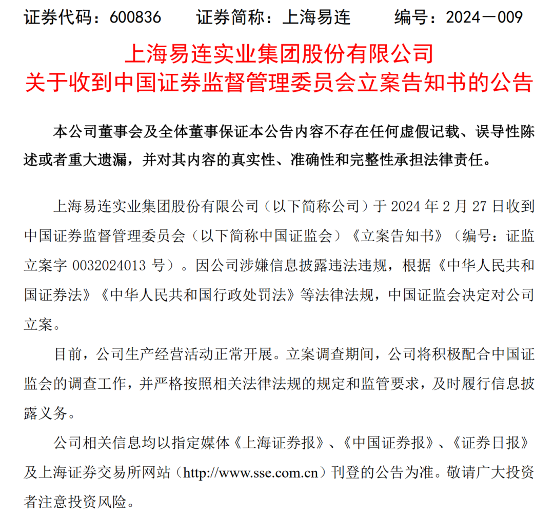 2月27日晚间,上海易连表示,公司收到了中国证监会的《立案告知书》。因公司涉嫌信息披露违法违规,中国证监会决定对公司立案。