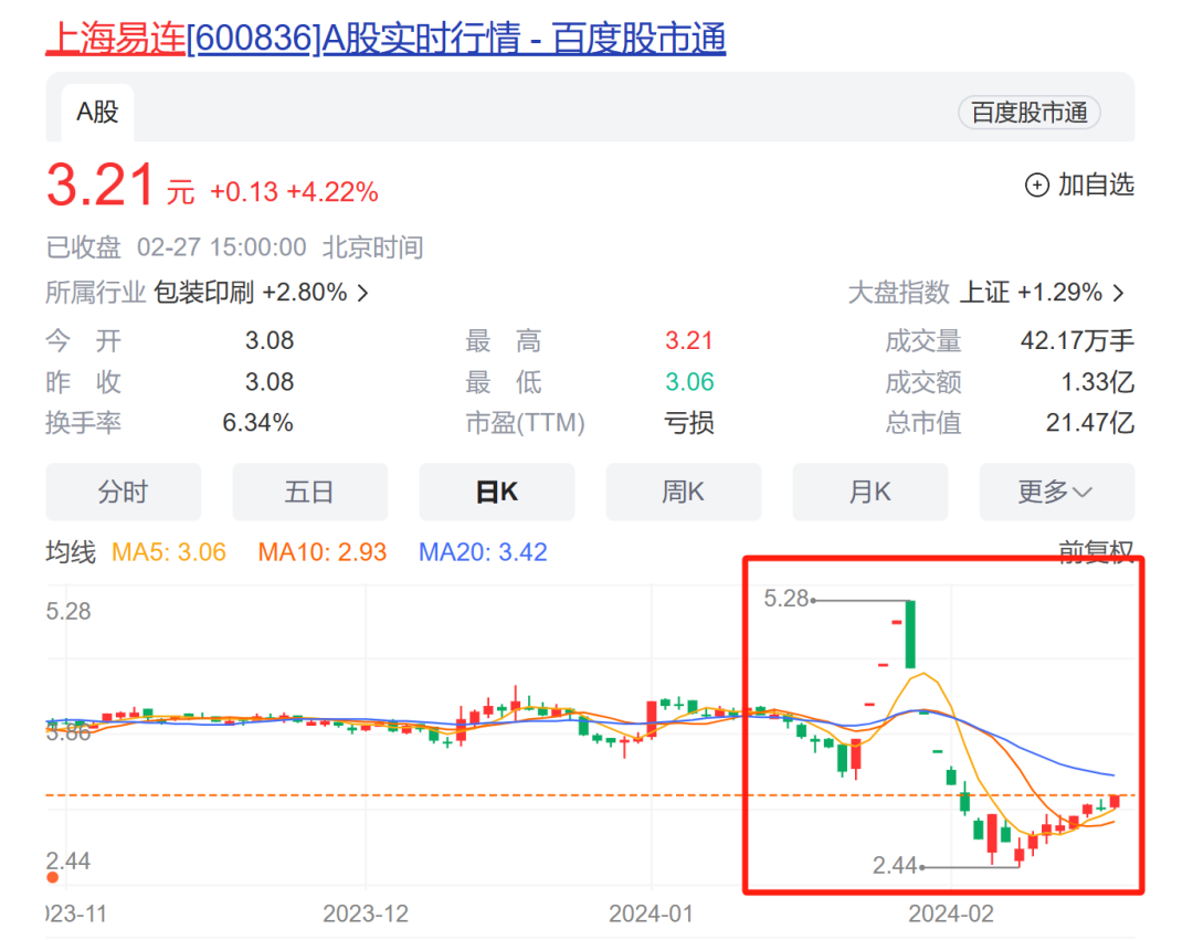 值得注意的是,在农历新年前的10余个交易日,上海易连曾经走出了让投资者看不懂的走势:先是连续拉升四个涨停板,紧接着在六天内走出了五个跌停板,期间振幅超过70%。