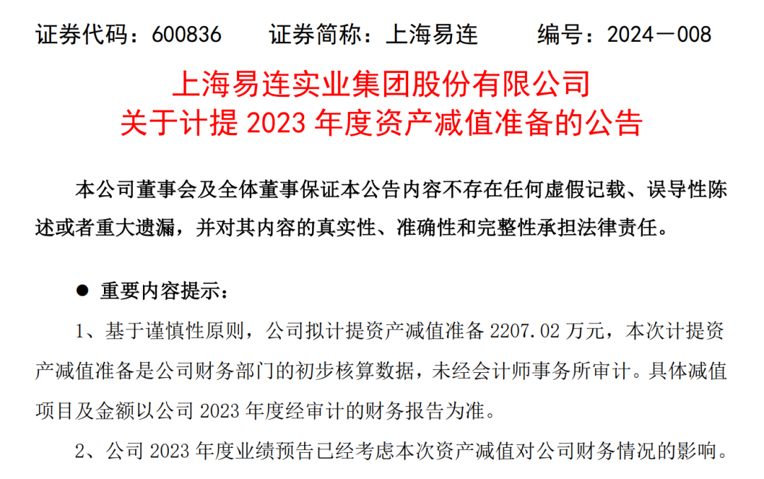 2月27日晚间,上海易连(600836)连续披露两则负面消息。一是公司2023年需要计提资产减值;二是因涉嫌信披违法违规,上海易连被中国证监会立案调查。