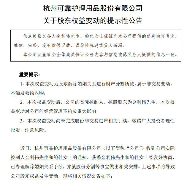 可靠股份2月28日晚间公告,经友好协商,实际控制人金利伟和鲍佳已办理解除婚姻关系手续,并就股份分割等事宜做出相关安排。