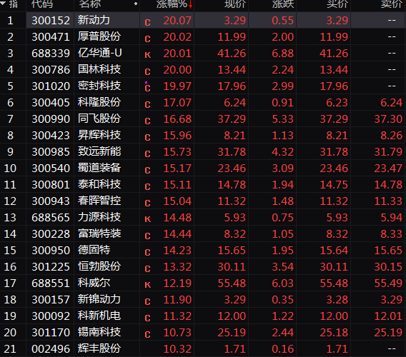 个股中,新动力、厚普股份、亿华通、国林科技、密封科技20cm涨停,四川金顶、京城股份、天永智能、康普顿、美锦能源涨停。据东方财富数据,截至收盘,板块内约有30只个股涨停,百余只个股涨幅5%以上。