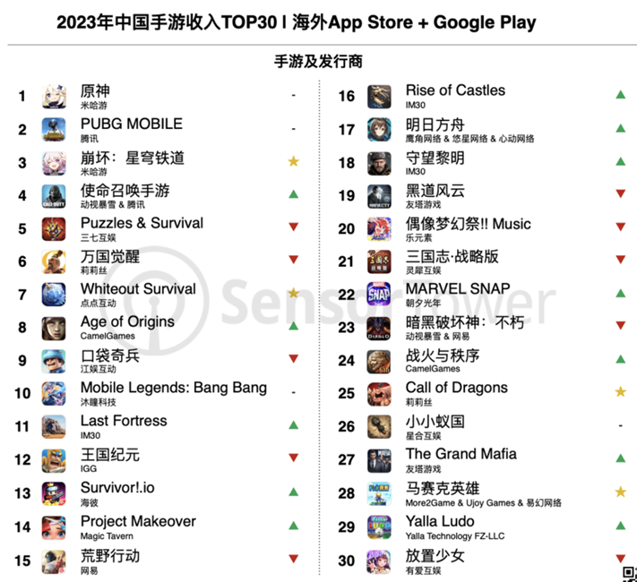 Data.ai表示,2023年国内共有27家手游发行商海外营收成功突破1亿美元,米哈游和腾讯是仅有的两家海外营收超过10亿美元的中国手游发行商。