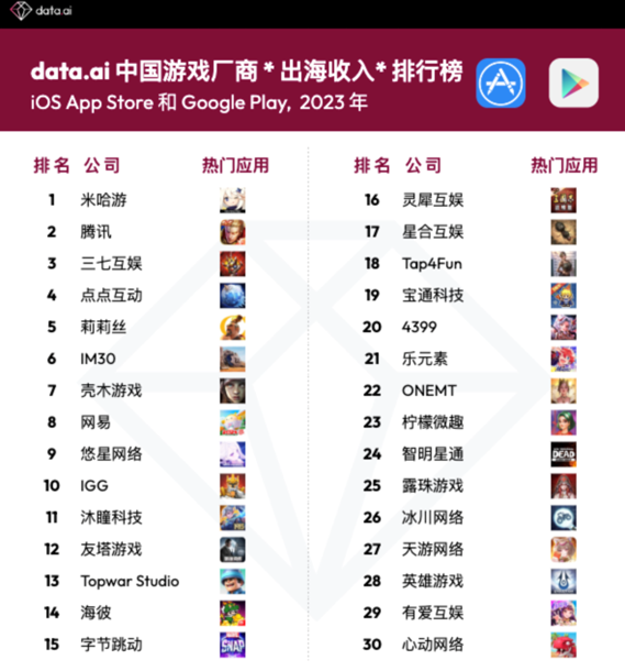 近日,第三方机构data.ai公布2023年中国游戏厂商及应用出海收入30强。其中米哈游超越腾讯,首次登顶年度出海收入榜榜首。