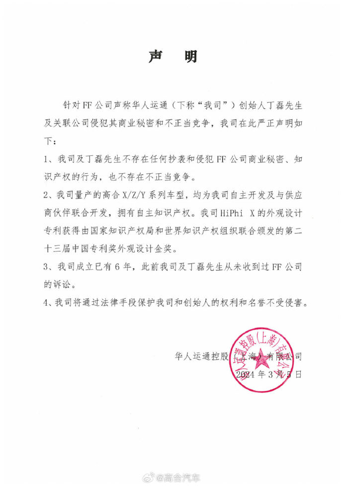 高合汽车回应被FF起诉:不存在任何抄袭和侵犯FF公司商业秘密、知识产权的行为