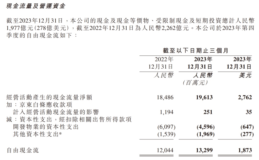 财报数据显示,2023年第四季度,京东集团实现营收3061亿元,同比增加3.6%;2023年全年收入约10847亿元,同比增加3.7%。2023年第四季度归属于公司普通股股东的净利润为34亿元,去年同期为30亿元。2023年全年归属于公司普通股股东的净利润为242亿元,2022年全年为104亿元。