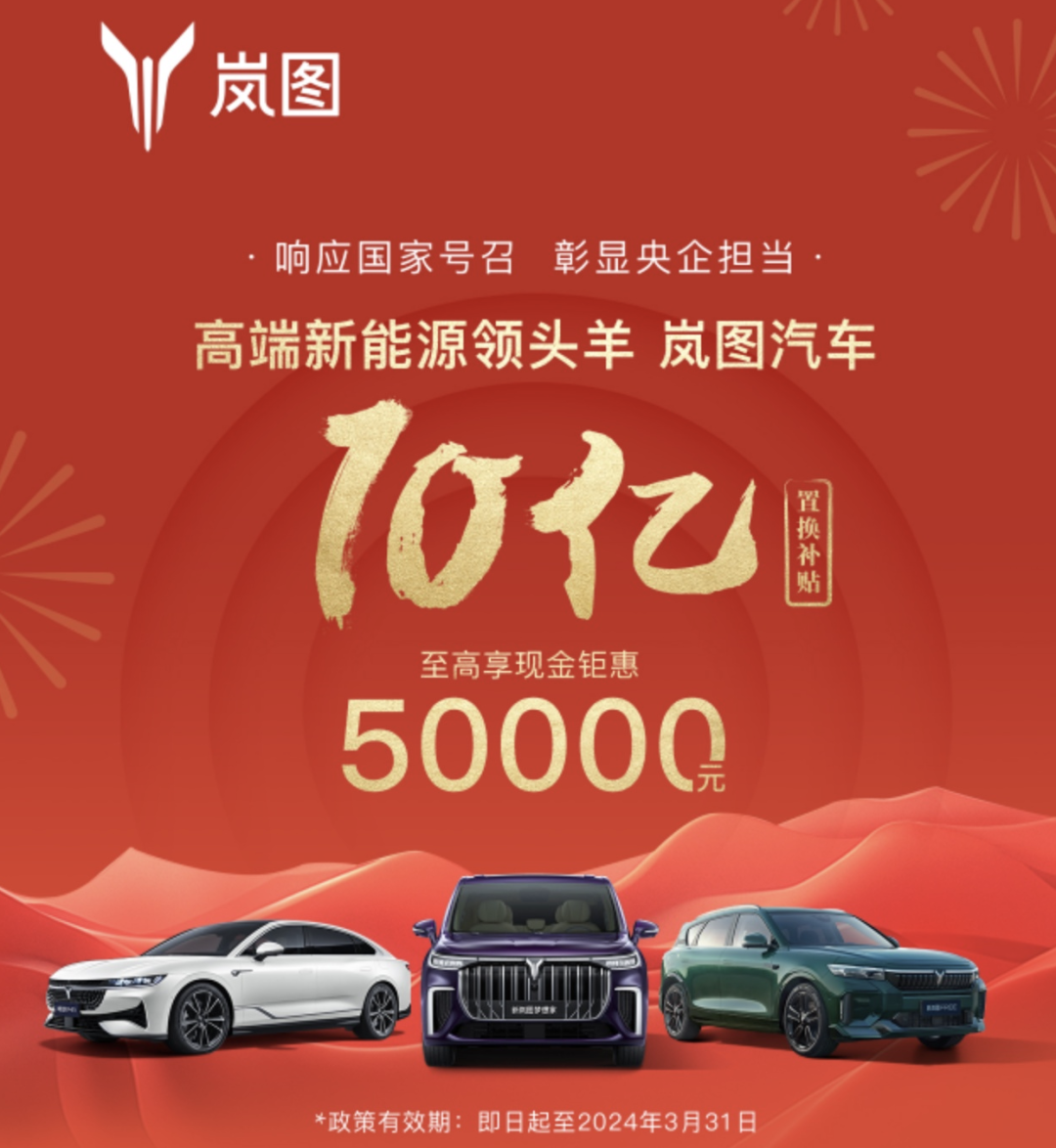 3月7日,岚图汽车作为首个响应国家政策号召的央企,宣布推出10亿元置换补贴政策,覆盖旗下岚图FREE、新岚图梦想家和岚图追光全系车型,购车至高可享5万元现金优惠。