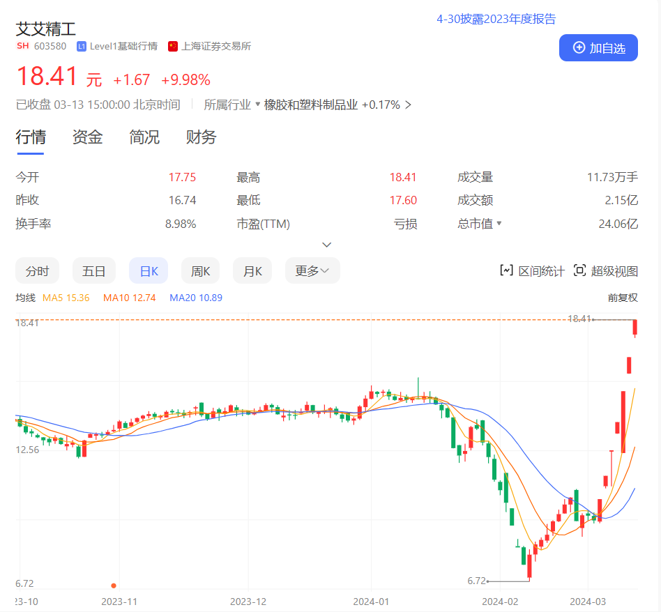 艾艾精工3月5日迎来今年首个涨停,当天成交额3947万元。3月6日成交额逼近亿元大关,3月7日成交额突破2亿元,3月11日成交额突破3亿元。3月13日,艾艾精工股价达到18.41元/股,7个交易日股价涨幅达到94.8%。