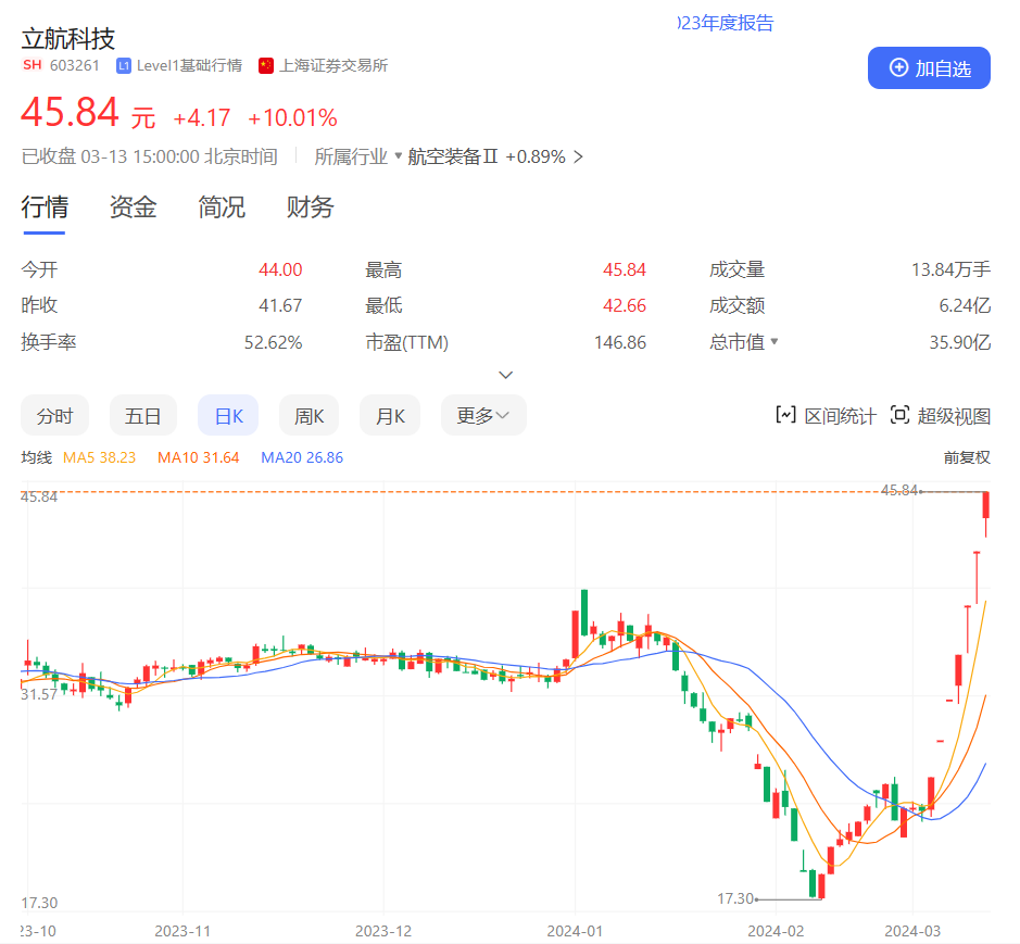 从3月5日开始,立航科技股价迎来本月首个涨停板。此后一路高歌猛进,到3月13日迎来七连板,公司股价达到45.84元/股,总市值达到35.9亿元。