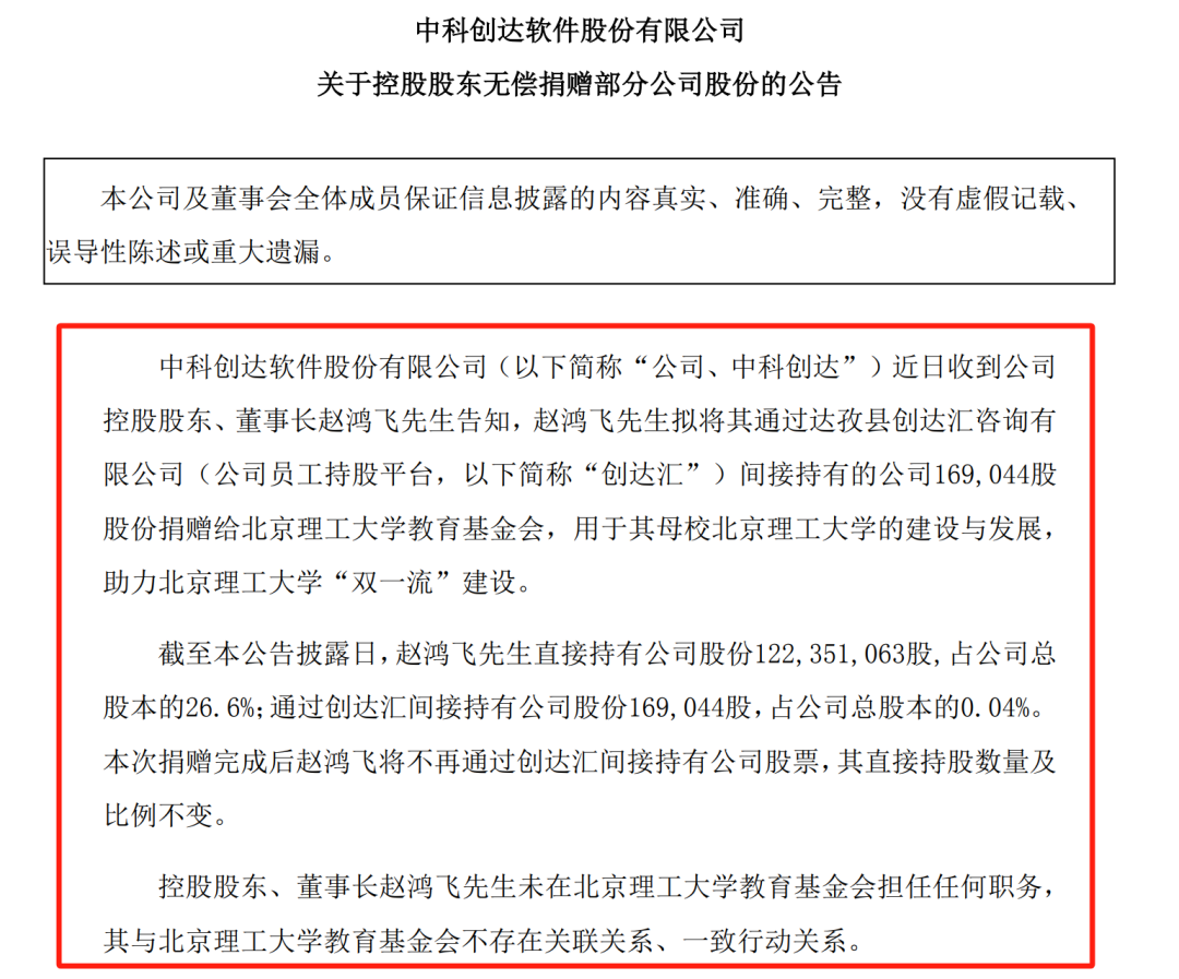 中科创达(300496)3月13日晚披露,公司控股股东赵鸿飞拟向北京理工大学教育基金会(下称“北理工教育基金会”)捐赠其间接持有的公司16.9万股股份。以中科创达当前股价估算,上述捐赠的股份市值约1041.38万元。如此大手笔的捐赠也引发了市场热议。