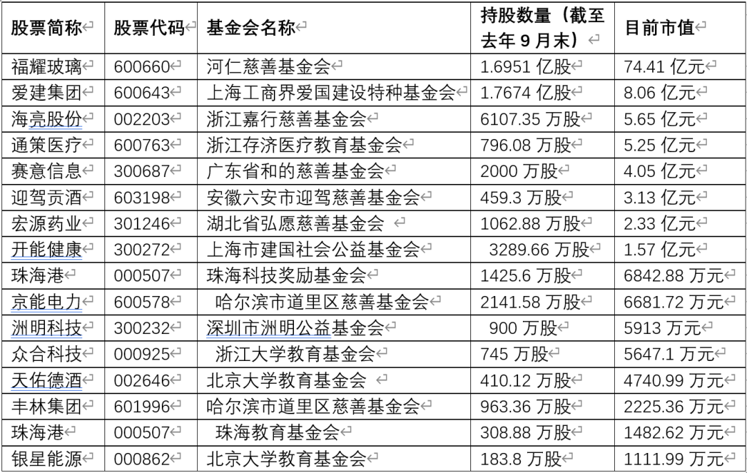 证券时报·e公司记者根据A股上市公司过往定期报告梳理发现,目前有十几家慈善基金会活跃其中。截至目前,这些基金会合计持股市值已超百亿元,其持股主要来自于上市公司股东捐赠。