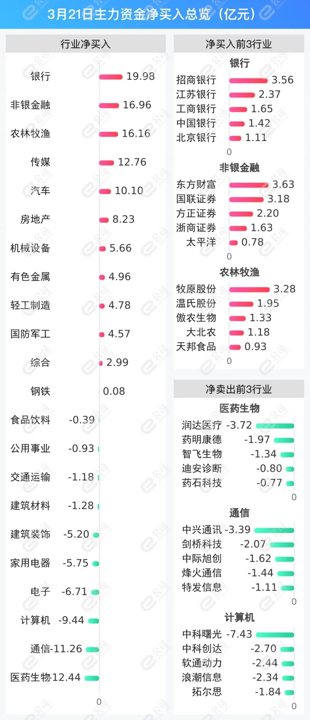 从行业层面看,银行、非银金融、农林牧渔获主力资金净买入金额居前,分别为19.98亿元、16.96亿元、16.16亿元。