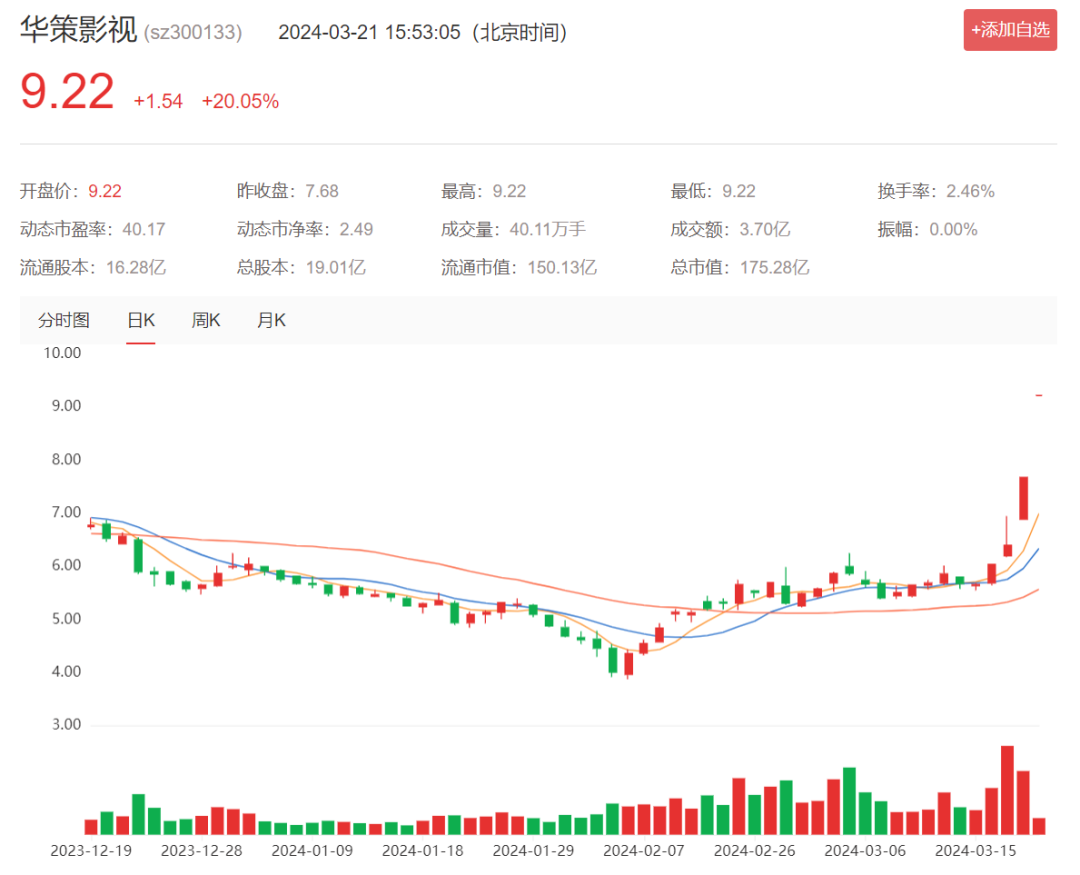 华策影视昨日20%涨停后,今日缩量一字涨停,股价创10个月来新高。