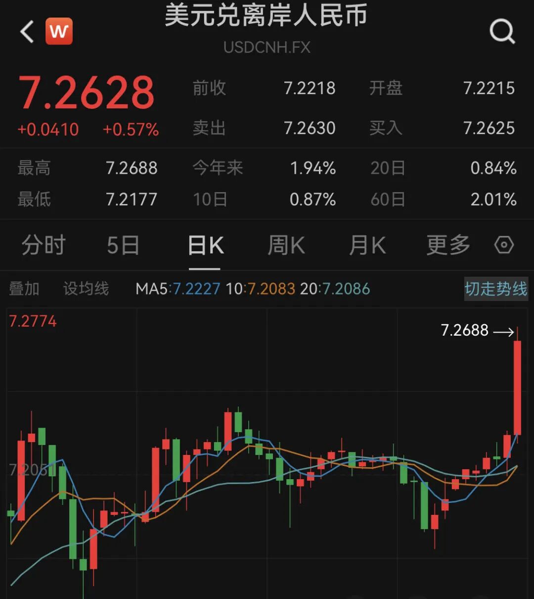 因瑞士央行的意外降息,提振美元表现。人民币也出现下跌走势,离岸人民币汇率大跌约400点突破7.26关口。在岸人民币方面,该市场汇率报7.2274元,较前收盘价跌超200个基点。