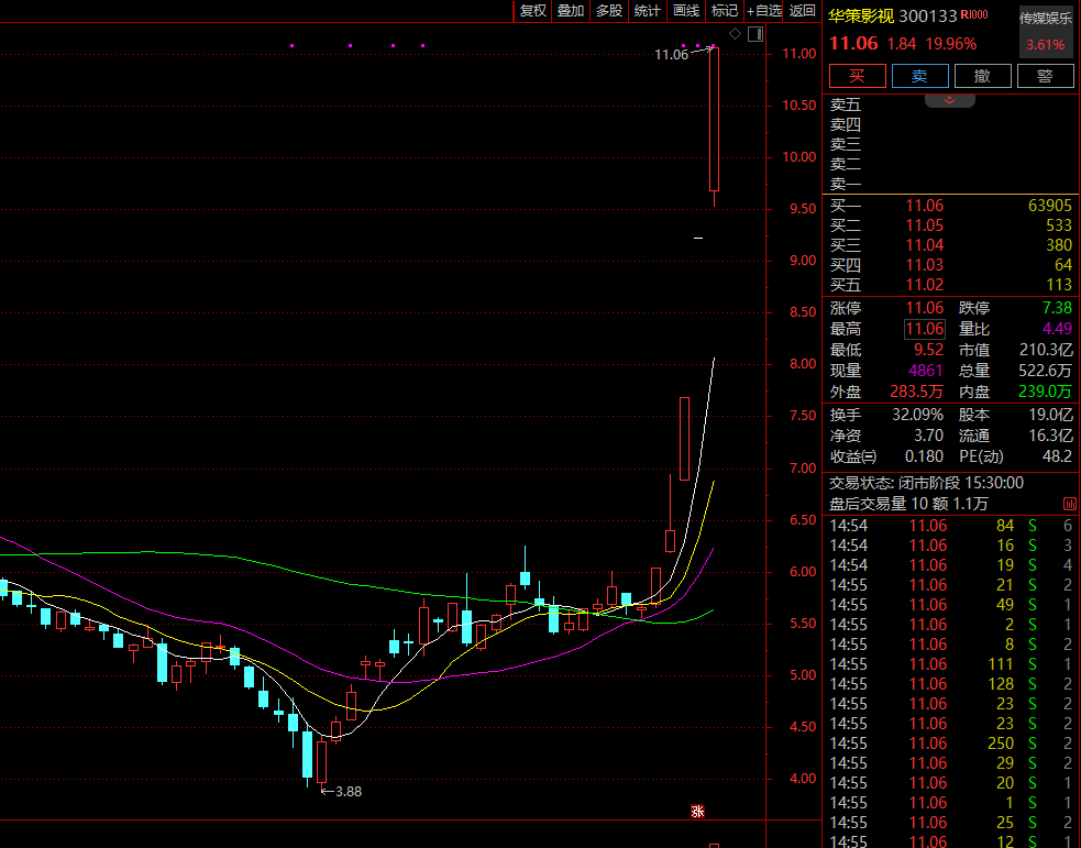 3月22日,申万传媒行业一度大涨逾3%,世纪天鸿、读客文化、华策影视20cm涨停,中文在线一度涨逾18%。中广天择、掌阅科技双双收获3连板。