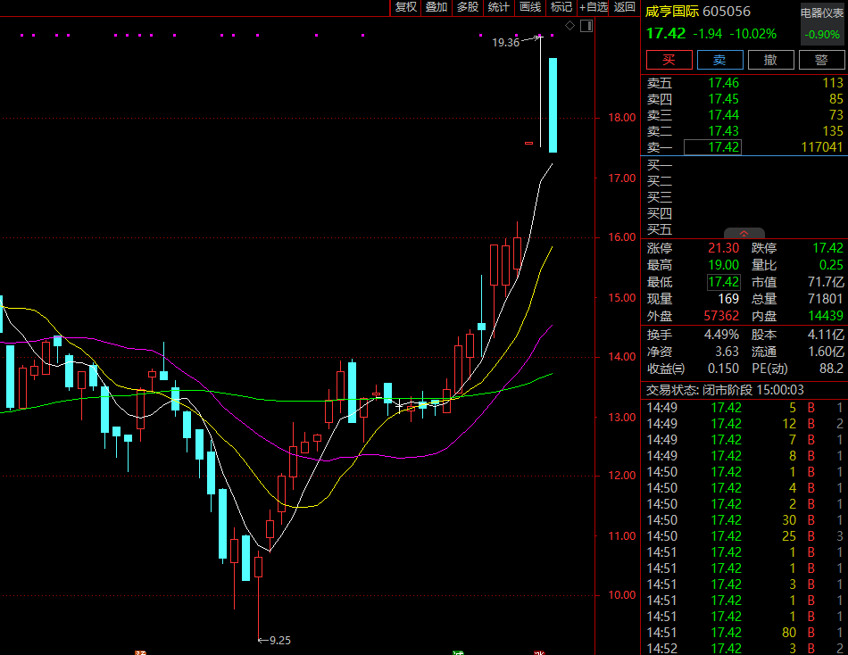 咸亨国际开盘股价直接压至跌停线直至收盘,咸亨国际股价收报17.42元/股。另外,多只低空经济概念股股价走低,纵横股份、立航科技、莱斯信息等多股跌幅居前。