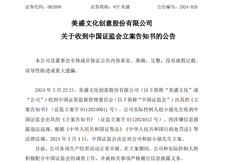 3月22日晚间,*ST美盛发布公告,因涉嫌信息披露违法违规,中国证监会已于2024年3月4日决定对公司及赵小强立案调查。公司表示,目前各项生产经营活动均正常开展,后续将积极配合调查工作,并就相关事项履行信息披露义务。