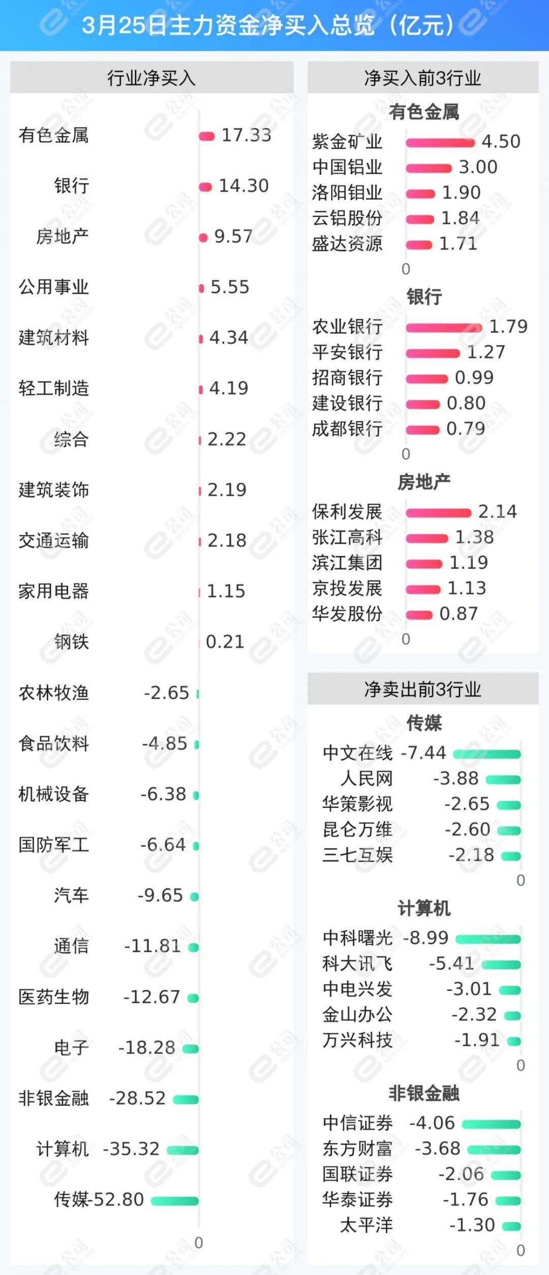 从行业层面看,有色金属、银行、房地产获主力资金净买入金额居前,分别为17.33亿元、14.3亿元、9.57亿元。