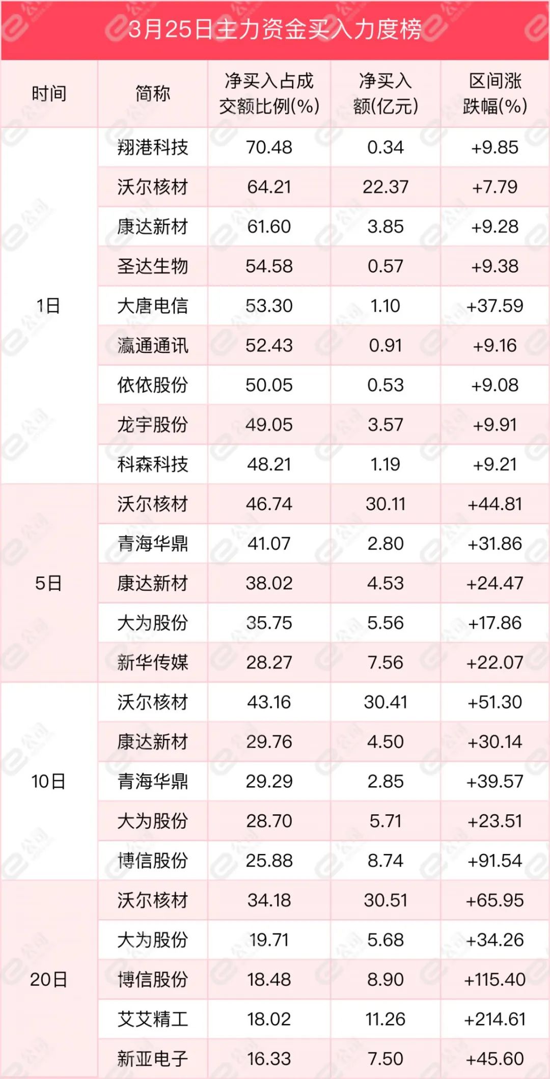 从主力资金买卖力度来看,翔港科技、沃尔核材、康达新材获主力资金大力买入,净买入额占当日成交额比例分别为70.48%、64.21%、61.6%,净买入额分别为0.34亿元、22.37亿元、3.85亿元。