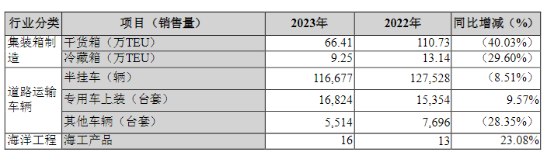 作为主营业务,中集集团集装箱制造业务2023年实现营业收入302.13亿元,同比下降约三成。其中,干货集装箱和冷藏箱累计销量分别同比下降约四成和近三成。在此背景下,中集集团去年营业收入1278.1亿元,同比下降9.70%,归母净利润约4.21亿元,同比下降约87%。
