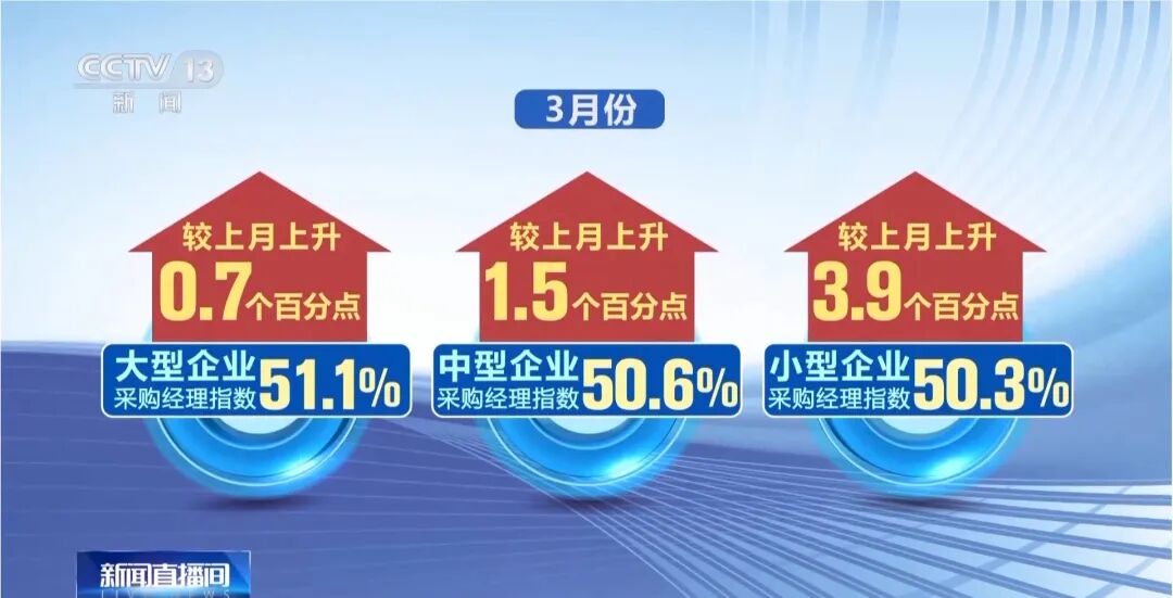 3月份,大中小型企业采购经理指数分别为 51.1%、50.6%和50.3%,较上月分别上升0.7、1.5和3.9个百分点,不同规模企业生产经营状况均有所改善。