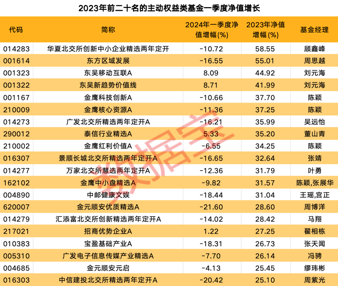 2023年全年净值增幅居前的主动权益基金一季度表现如何?数据宝统计,2023年全年净值增幅前20强的主动权益类基金一季度净值多数录得下跌,仅老将刘元海管理的东吴新趋势价值线、东吴移动互联A,董山青管理的泰信行业精选A和翟相栋管理的招商优势企业A录得上涨,涨幅依次为8.71%、8.09%、5.33%、1.22%。