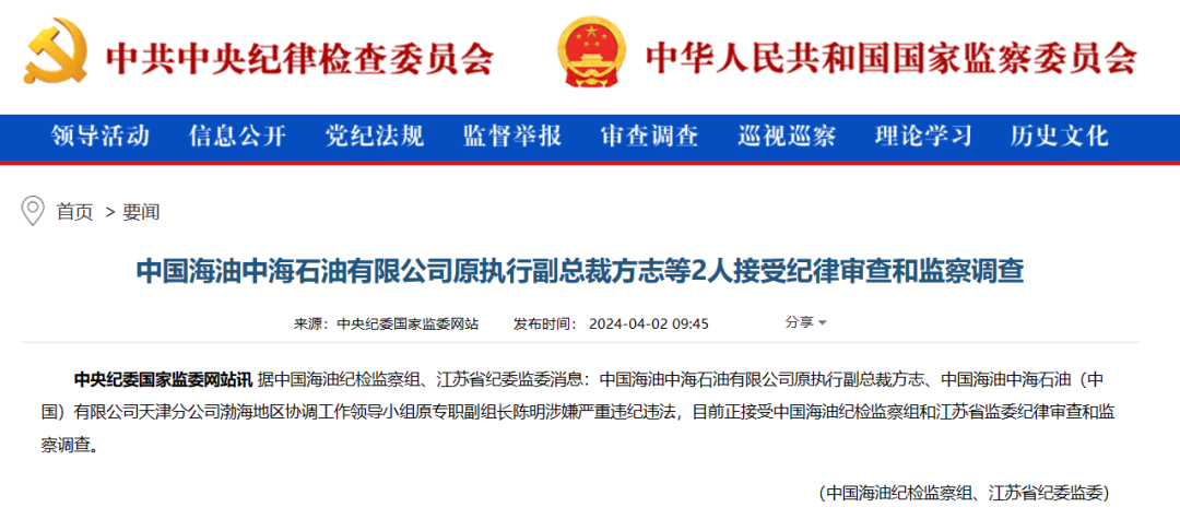 4月2日,中央纪委国家监委通报:中国海油中海石油有限公司原执行副总裁方志、中国海油中海石油(中国)有限公司天津分公司渤海地区协调工作领导小组原专职副组长陈明涉嫌严重违纪违法,目前正接受中国海油纪检监察组和江苏省监委纪律审查和监察调查。