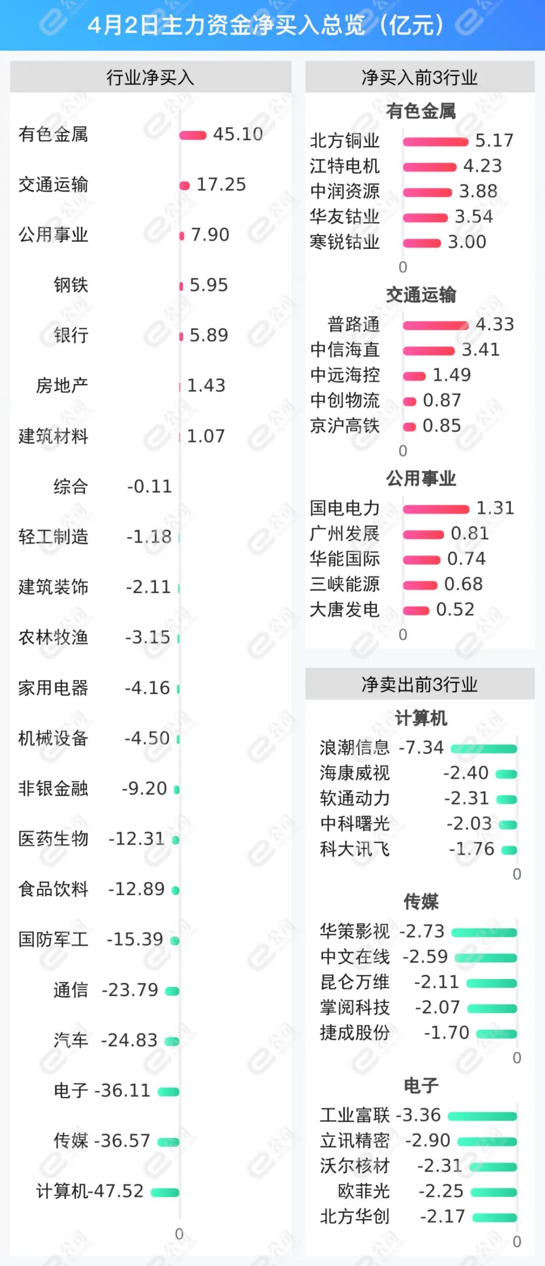 e公司数据统计显示,4月2日沪深两市主力资金净流出76.95亿元。
