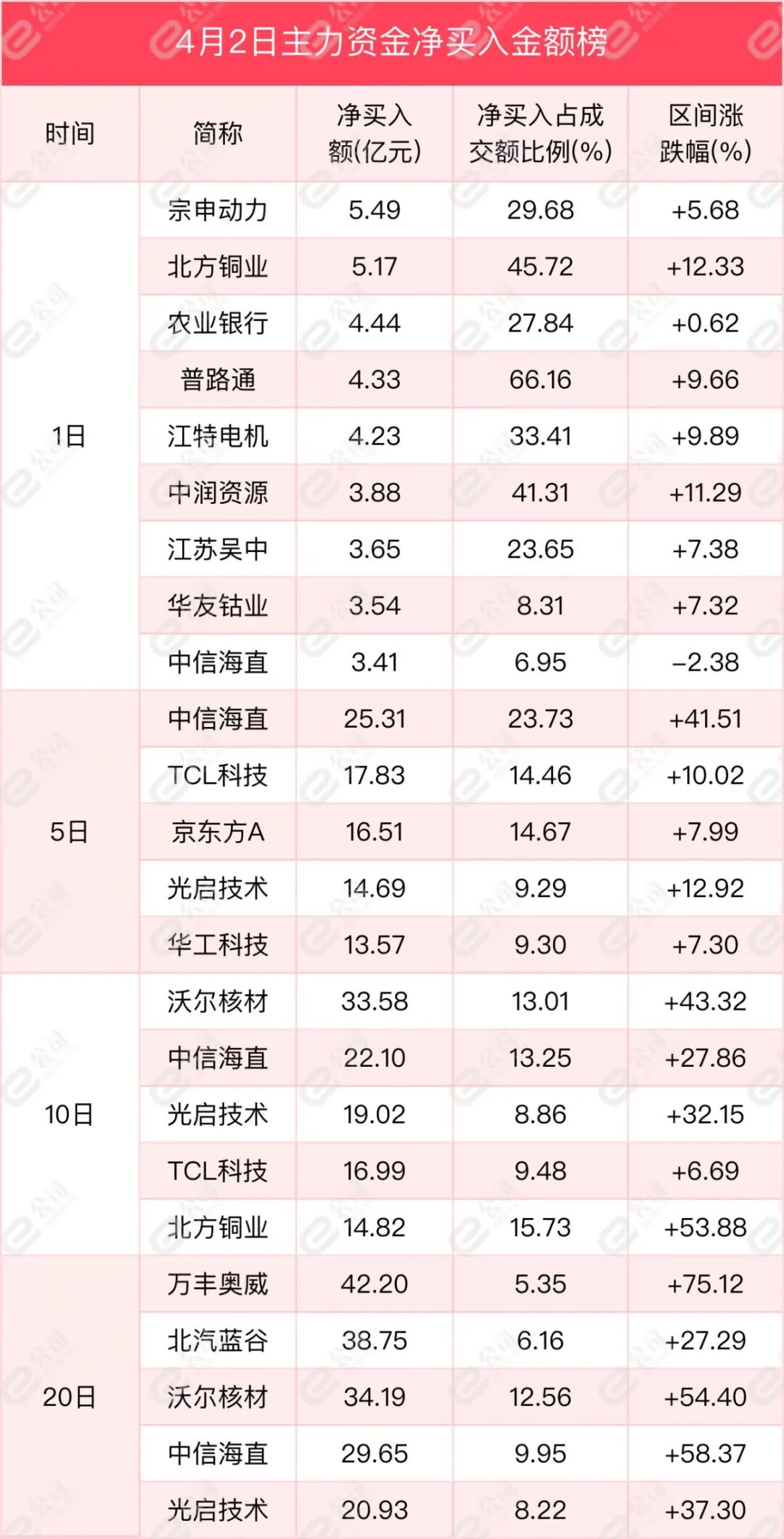 从买卖金额来看,宗申动力、北方铜业、农业银行获主力资金净买入金额居前,分别为5.49亿元、5.17亿元、4.44亿元,占当日成交额29.68%、45.72%、27.84%。