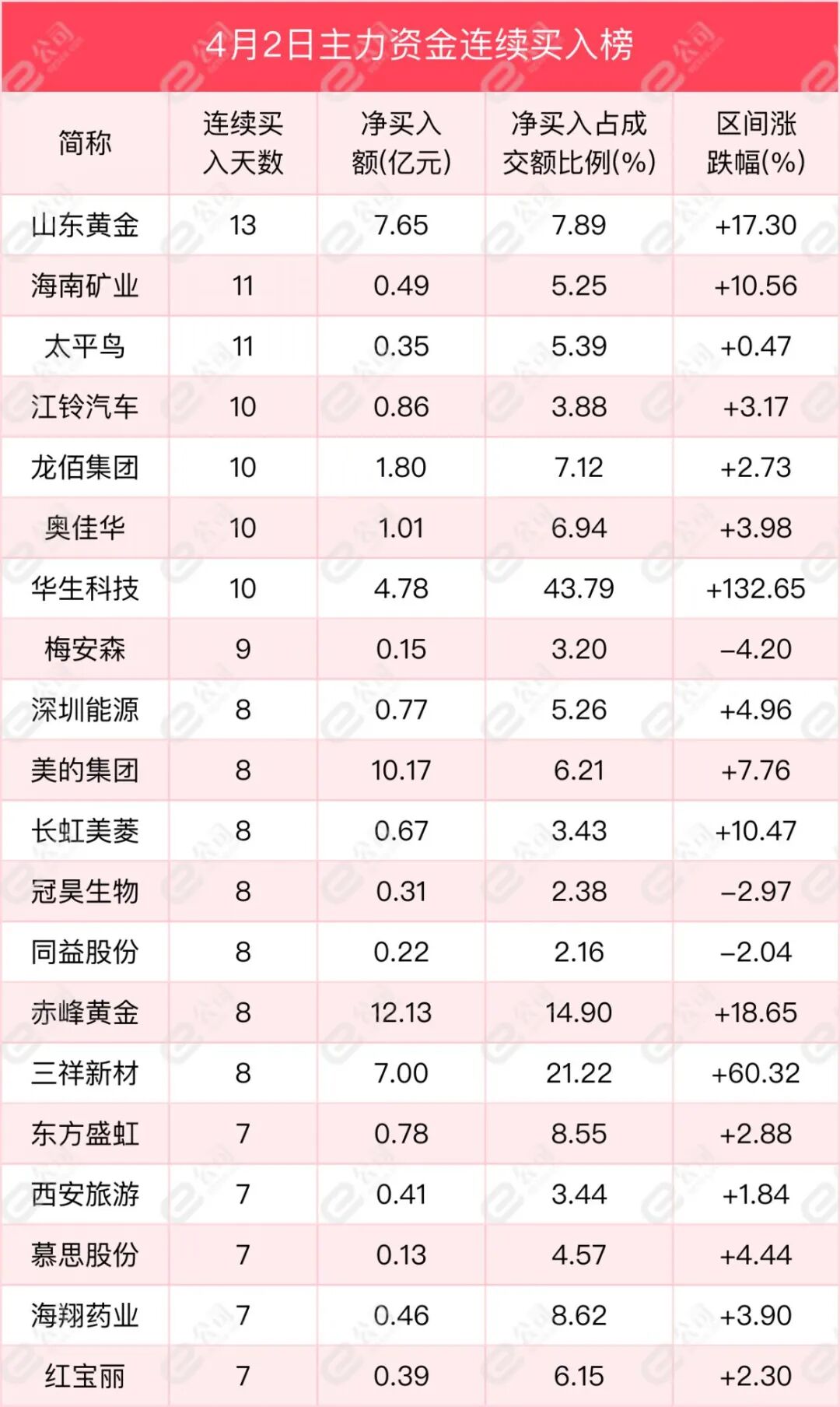从连续买卖来看,山东黄金、海南矿业、太平鸟获主力资金连续净买入天数居前,分别为13天、11天、11天,期间净买入额分别为7.65亿元、0.49亿元、0.35亿元,占期间成交额比例分别为7.89%、5.25%、5.39%。