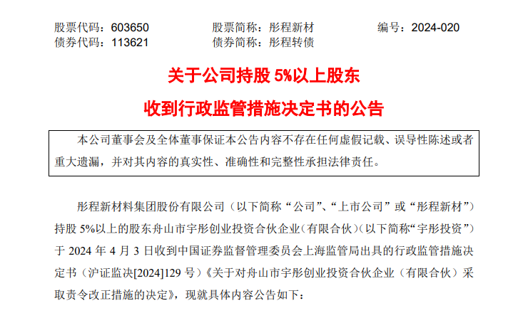 4月3日晚,彤程新材公告,公司一名股东因违规减持,被上海证监局采取责令改正的行政监管措施。该股东承诺,将购回超比例减持股份。