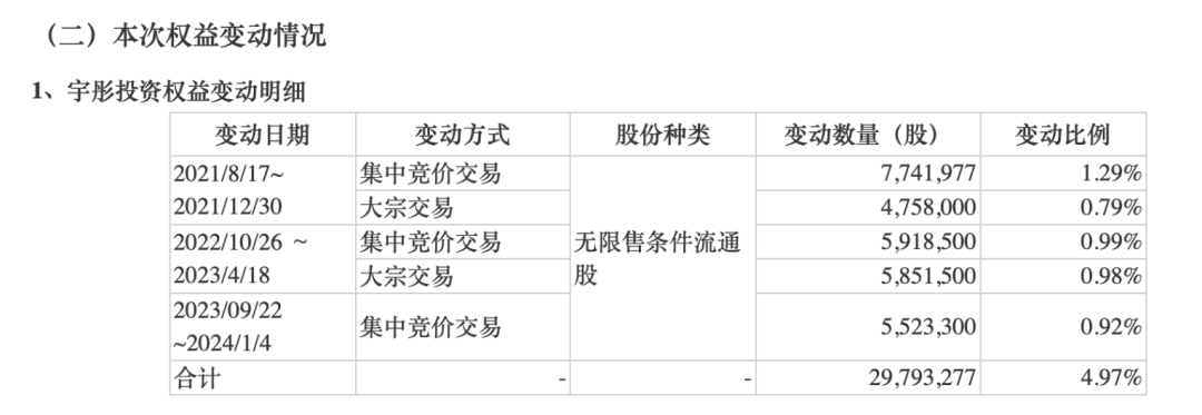 根据今年1月彤程新材披露的公告,舟山宇彤前后三轮减持,共减持了2979.3万股,变动比例为4.97%,主动减持未及5%。
