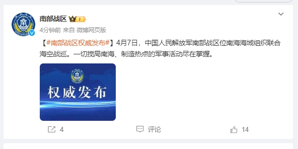 证券时报e公司讯,据南部战区消息,4月7日,中国人民解放军南部战区位南海海域组织联合海空战巡。一切搅局南海、制造热点的军事活动尽在掌握。