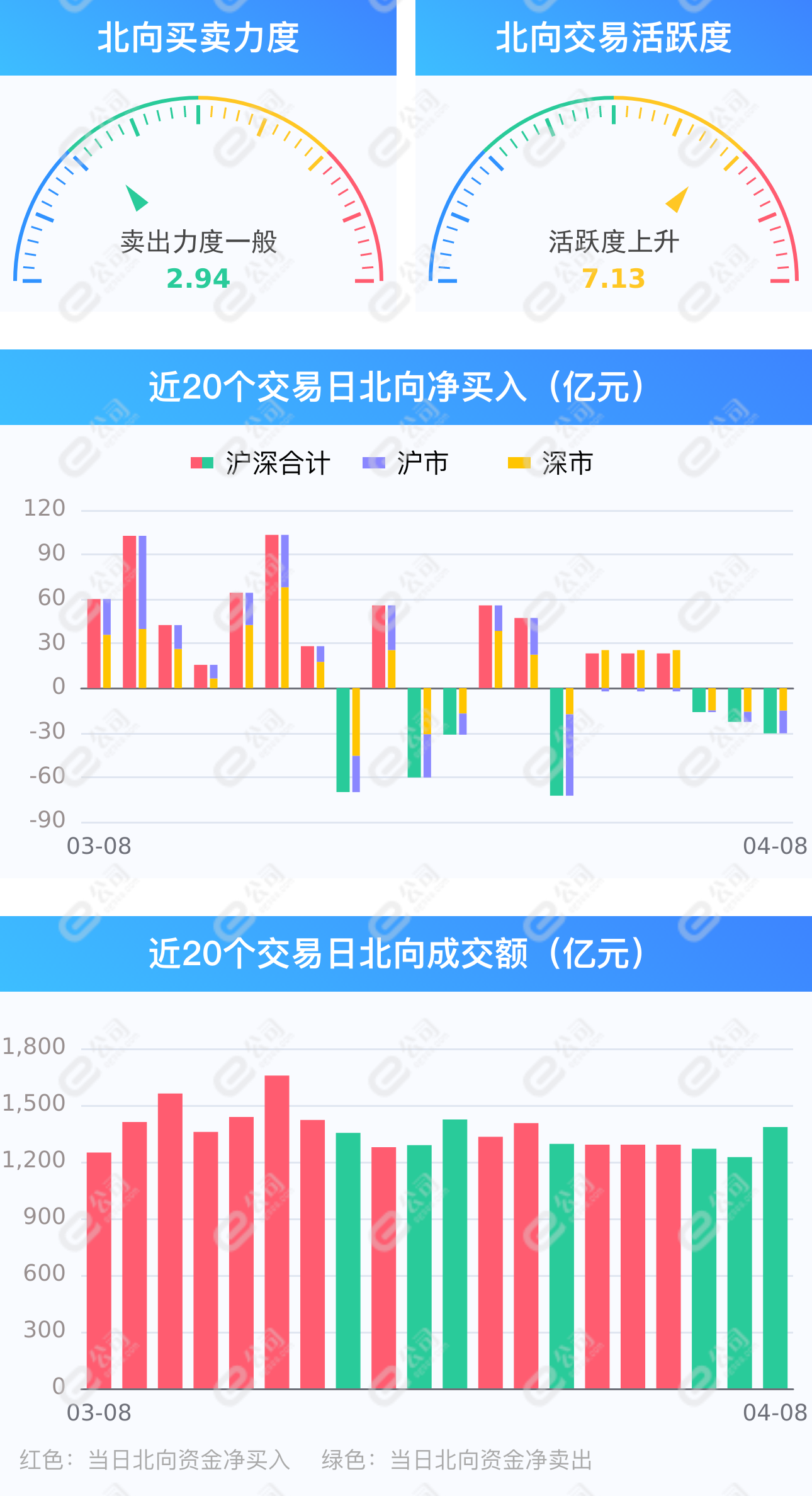 证券时报e公司讯,4月8日,截至A股收盘,北向资金合计净卖出30.45亿元,其中沪股通净卖出15.21亿元,深股通净卖出15.24亿元。北向资金成交金额1383.55亿元,占A股总成交额14.85%,交易活跃度上升13.04%。