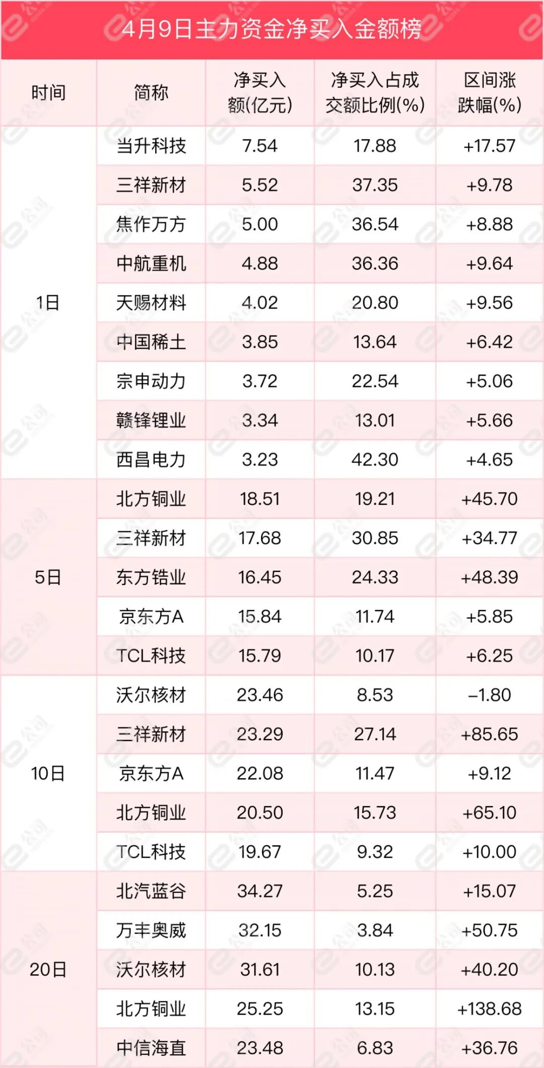 从买卖金额来看,当升科技、三祥新材、焦作万方获主力资金净买入金额居前,分别为7.54亿元、5.52亿元、5亿元,占当日成交额17.88%、37.35%、36.54%。