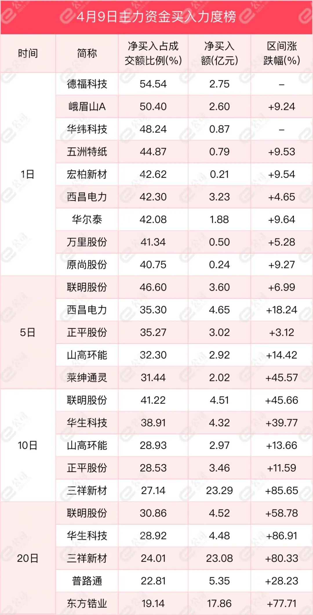 从主力资金买卖力度来看,德福科技、峨眉山A、华纬科技获主力资金大力买入,净买入额占当日成交额比例分别为54.54%、50.4%、48.24%,净买入额分别为2.75亿元、2.6亿元、0.87亿元。