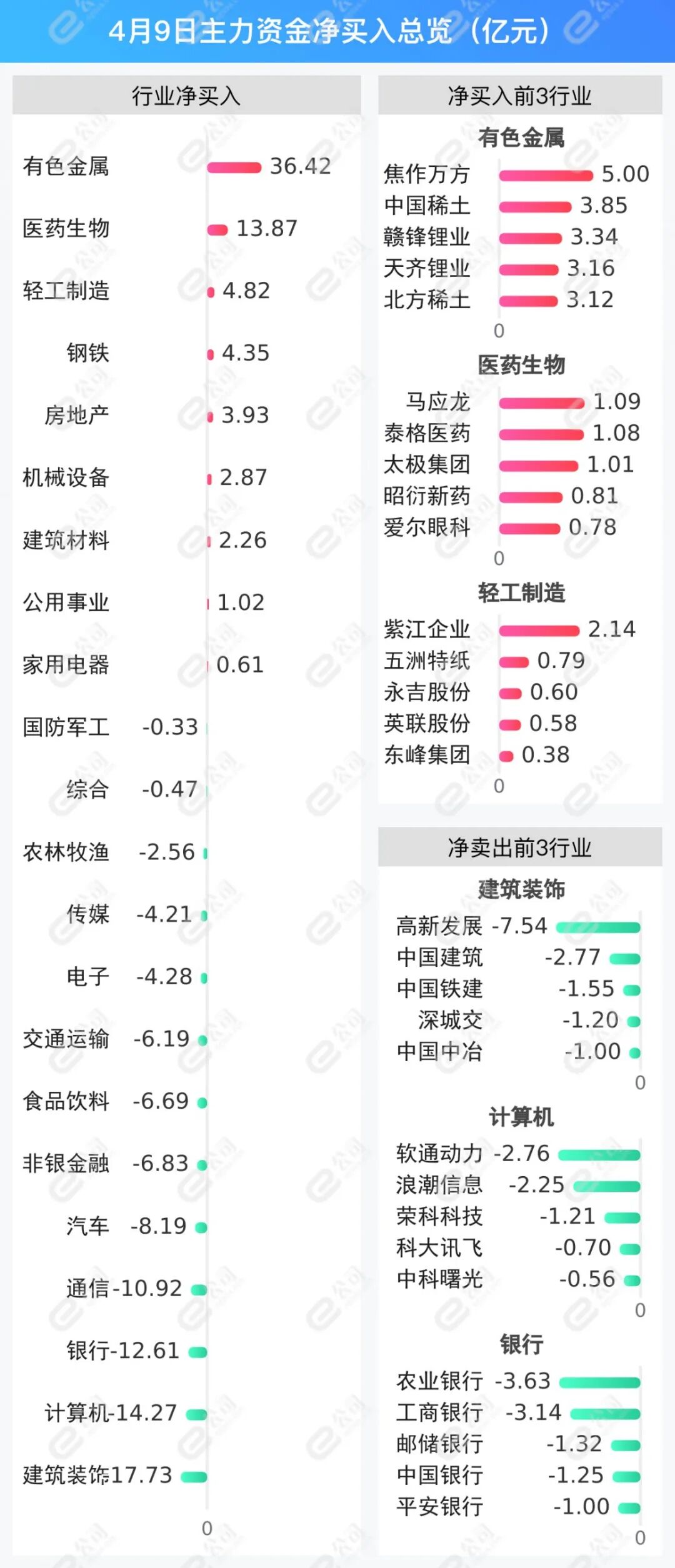从行业层面看,有色金属、医药生物、轻工制造获主力资金净买入金额居前,分别为36.42亿元、13.87亿元、4.82亿元。
