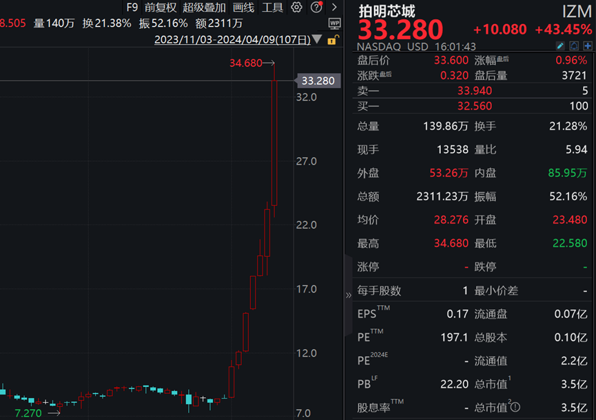 中国电子元件供应商拍明芯城单日大涨逾43%,4月份以来累计涨近300%。