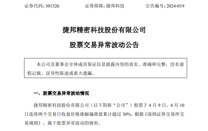 捷邦科技表示,公司关注到部分媒体和股吧等平台对公司业务相关讨论涉及热点概念以及有少数投资者散布短线炒作公司股价的言论。公司于2024年4月3日在互动易回复投资者提问时,提到公司可以依照客户需求,定制开发应用于固态电池的碳纳米管产品。截至目前,公司上述产品仍处于实验室制备阶段,尚未贡献收入。在效果预期方面,存在效果不达预期或研发失败的风险,后续能否获得客户认可具有不确定性,未来产生的经济效益和对公司业绩的影响存在不确定性。