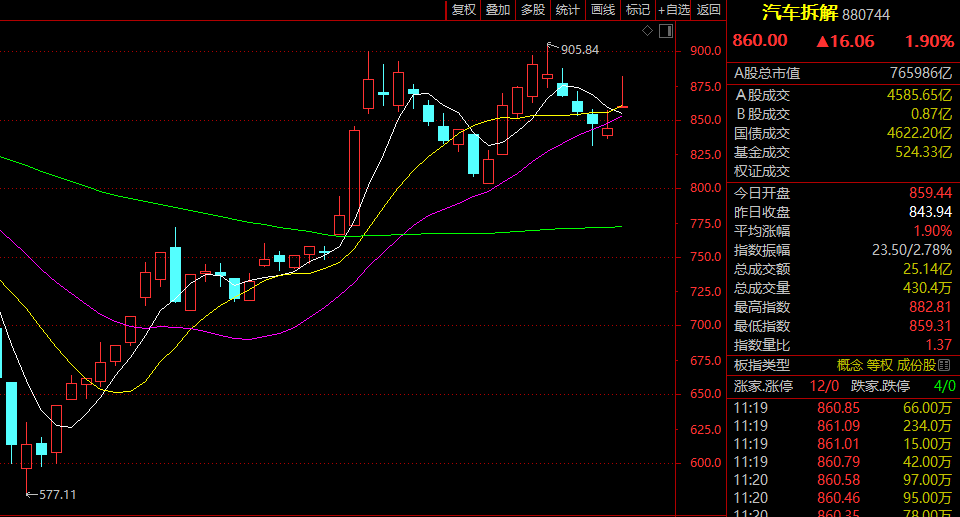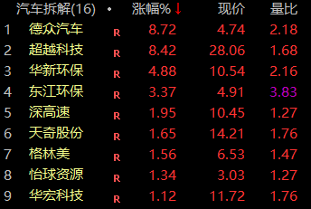 早间,汽车拆解概念走强,板块指数放量高开高走,盘中一度涨逾4%,半日成交超昨日全天成交。德众汽车、超越科技、华新环保、东江环保等盘存均出现直线拉升的走势。