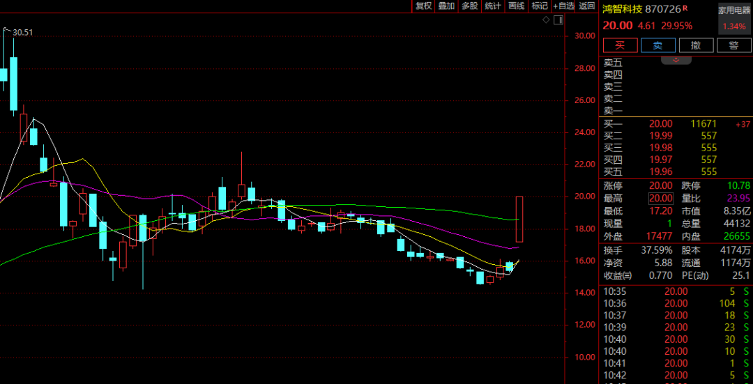 个股掀起涨停潮,鸿智科技开盘仅约10分钟就30%涨停,开盘不到1分钟成交就超昨日全天成交;宏昌科技、北鼎股份均在短短的几分钟之内垂直20%涨停;春兰股份、雪祺电气等逾10股涨停或涨超10%。