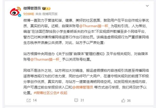 微博一直致力于营造和谐、健康、美好的社区氛围,鼓励用户在平台创作或分享优质、真实的内容。近期,自媒体账号@Thurman猫一杯_ 为吸粉引流,人为策划、编造“在法国巴黎拾到小学生秦朗丢失的作业本”不实视频并散播至多个网络平台,警方已对其涉嫌传播网络谣言行作出行政处罚。该编造虚假视频行为严重损害网络生态秩序并浪费公共资源,对此,站方予以严肃处置: